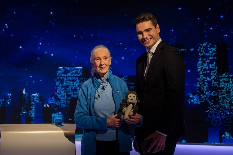 Do studia přišla na první pohled maličká, ale hned na druhý velká dáma s jasným přesvědčením, obrovskou energií a radostí. Svým výzkumem šimpanzů způsobila revoluci, postupně (úplně) proměnila naše vnímání našich příbuzných, se kterými sdílíme 99 % DNA - zjistila, že používají nástroje, jí maso, sledovala jejich radost, smutek i boje. Ji samotnou jeden ze šimpanzů málem zabil - a zabil by, kdyby chtěl. A co hlavně: zjistila, že díky (nebo kvůli) tomu všemu, jsou jako my..